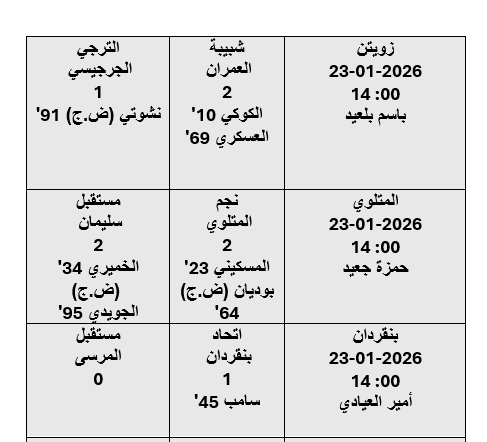 الشعب نيوز / كاظم بن عمار - جرت اليوم الجمعة 23 جانفي 2026 مباريات الدفعة الخامسة و الأخيرة من مقابلات الجولة الثانية إياب لبطولة الرابطة المحترفة الأولى لكرة القدم موسم 2025-2026 وأسفرت عن النتيجة التالية :