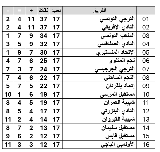 و على ضوء نتائج مباريات اليوم ، يصبح ترتيب البطولة عقب نهاية مقابلات الجولة 17 على النحو التالي :
