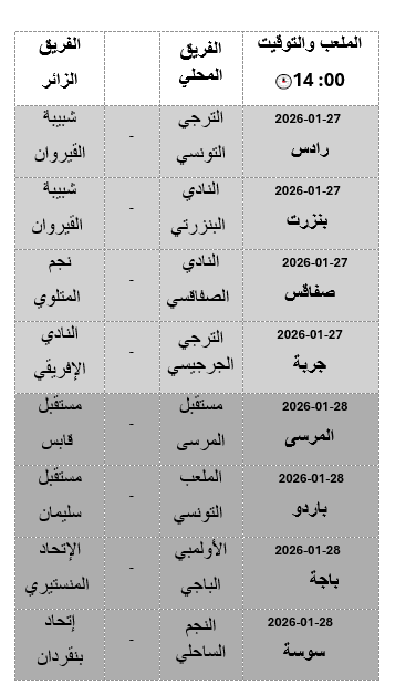 ستدور مباريات الجولة الثامنة عشرة لبطولة الرابطة المحترفة الاولى لكرة القدم على دفعتين الثلاثاء 27 والاربعاء 28 جانفي 2026 الجاري بداية من الساعة الثانية ظهرا (14) على النحو الاتي: