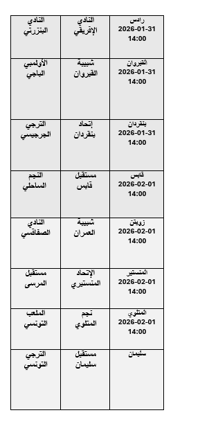 تدور يومي السبت 31 جانفي والأحد 01 فيفري 2026 الجاري، مقابلات الجولة الرابعة إياب لبطولة الرابطة المحترفة الأولى لكرة القدم بداية من الساعة الثانية بعد الزوال، وفق البرنامج التالي:
