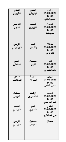 وتُعوّل الإدارة الوطنية للتحكيم من خلال هذه التعيينات على ضمان حسن سير المقابلات وتوفير مناخ تنافسي عادل، في ظل الحساسية الكبيرة التي تميّز هذه المرحلة من الموسم، فيما تبقى الأنظار موجّهة إلى أداء الحكّام ومدى نجاحهم في إدارة المباريات وفق قواعد اللعب النظيف.