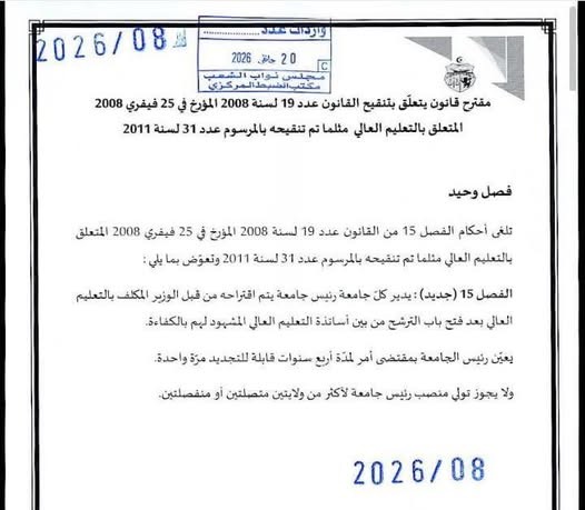ورغم أنّ المشروع يقترح تحديد مدة الولاية بأربع سنوات قابلة للتجديد مرة واحدة، فإنّ هذا القيد الزمني لا يغيّر من الطبيعة القانونية للآلية المعتمدة، ولا يعوّض غياب مسار انتخابي أو تشاركي قائم على البرامج والتقييم والمحاسبة أمام الهياكل الجامعية.