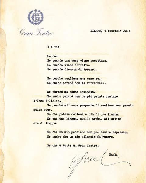وكان غالي قد رسالة على وسائل التواصل الاجتماعي عشية حفل افتتاح دورة ألعاب ميلانو-كورتينا 2026 ، حيث من المتوقع أن يشارك فيها. يتناول النص، الذي نُشر باللغات الإيطالية والإنجليزية والعربية ، فكرةً واضحة: متى يُقبل صوتٌ ما ، ومتى يصبح "زائداً عن الحاجة".
