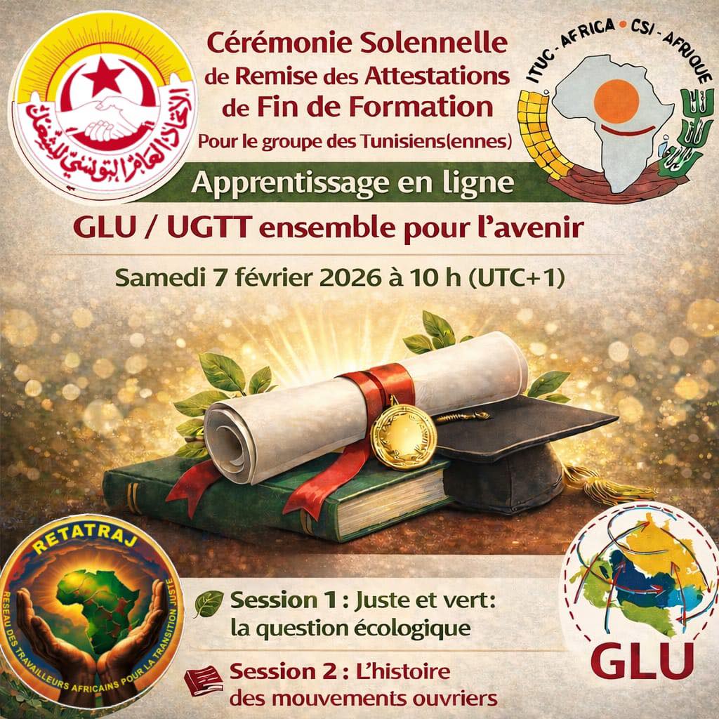 الشعب نيوز/ تونس - اختتم قسم التكوين النقابي والأنشطة الثقافية بالتعاون مع قسم العلاقات الدولية والعربية يوم السبت 7 فيفري 2026 الدورة التكوينية عن بُعد التي تنظمها الجامعة العالمية للعمال GLU.