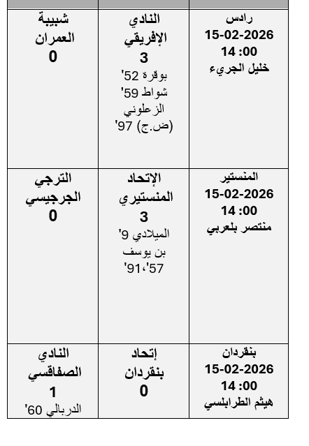 الشعب نيوز / كاظم بن عمار - جرت اليوم الأحد 15 فيفري 2026 مباريات الدفعة الثالثة من مقابلات الجولة 21 لبطولة الرابطة المحترفة الأولى لكرة القدم موسم 2025-2026 وأسفرت عن النتائج التالية :