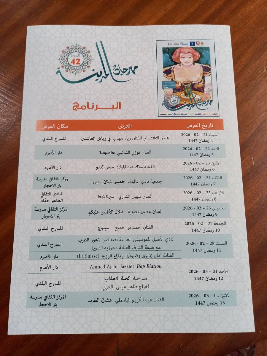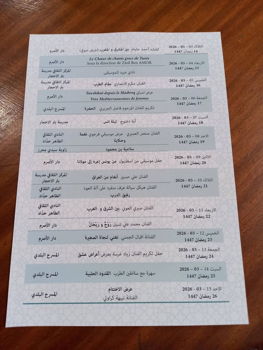 الشعب نيوز / ناجح مبارك - يفتتح ليلة السبت 21 فيفري 2026 مهرجان المدينة سلسلة سهراته مع الفنان رياض مهدي بعرض صوفي بعنوان "رياض العاشقين" مع حفلات أخرى لنادي الأصيل للموسيقى العربية بصفاقس بعنوان "زهور الطرب" ونغني مع المجموعة الفنانة محرزية الطويل ومشاركة عدد من العازفين الشبان .