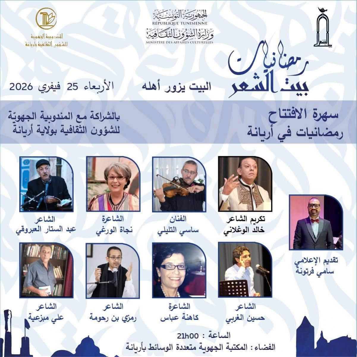 الشعب نيوز / ناجح مبارك - تحت إشراف وزارة الشؤون الثقافية، ينظّم بيت الشعر التونسي، من 25 فيفري الى 12 مارس 2026، تظاهرة "رمضانيات بيت الشعر" في دورتها الثانية تحت شعار "البيت يزور أهله"، وذلك ضمن برنامج "رمضانيات في الجهات"، تأكيدًا على انفتاح الشعر على محيطه الطبيعي وترسيخًا لمبدأ تقريب الفعل الثقافي من المواطن في مختلف ولايات الجمهورية.