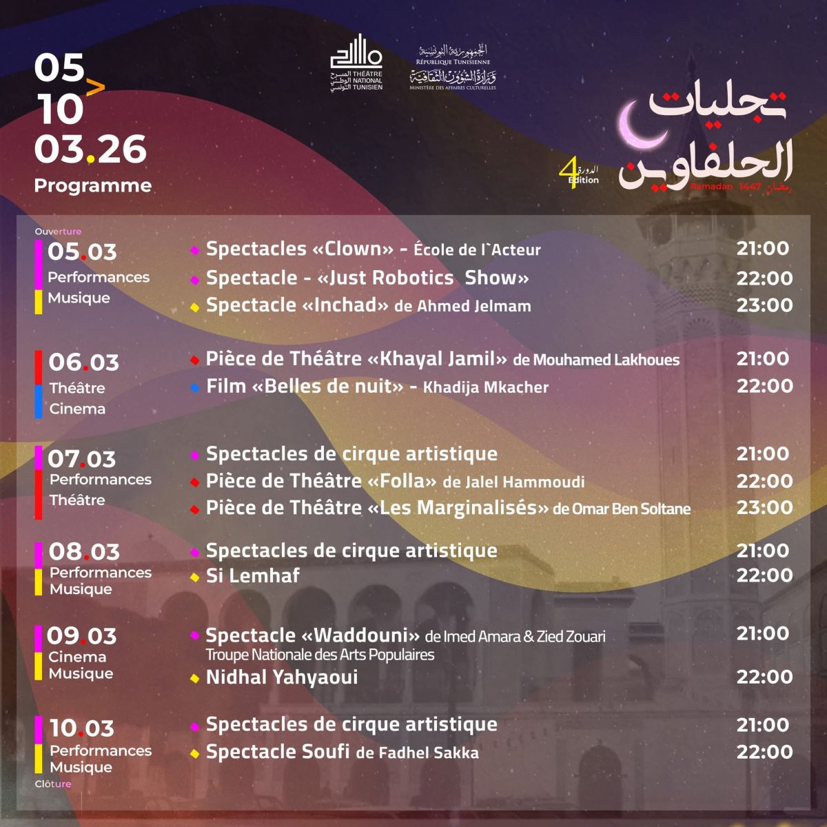 الشعب نيوز / ناجح مبارك - في إطار دعمه المتواصل للفنون الحيّة وسعيه لتنشيط الحركية الثقافية داخل الفضاءات المفتوحة، ينظّم المسرح الوطني التونسي الدورة الرابعة من تظاهرة «تجليات الحلفاوين»، وذلك تزامنا مع شهر رمضان المعظّم، ببطحاء الحلفاوين في قلب المدينة العتيقة.