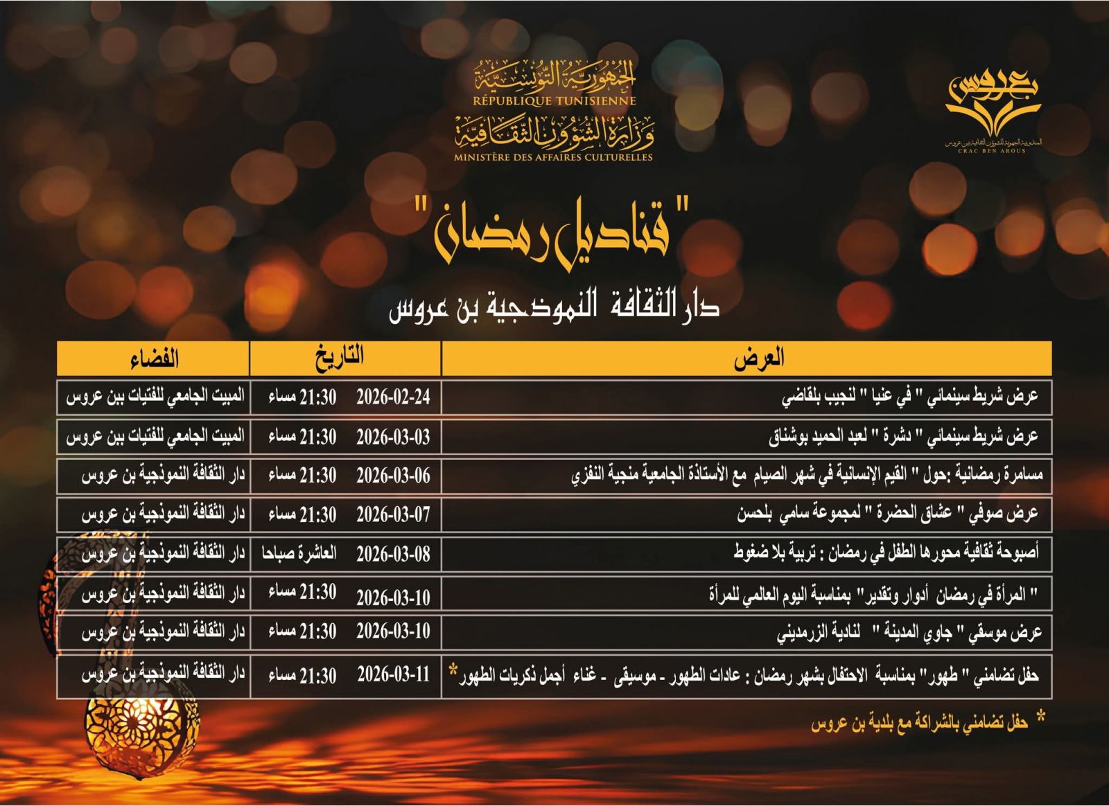 تظاهرة قناديل رمضان 24 فيفري ومن 3 إلى 15 مارس 2026 بدار الثقافة النموذجية ببن عروس والمبيت الجامعي للفتيات ببن عروس