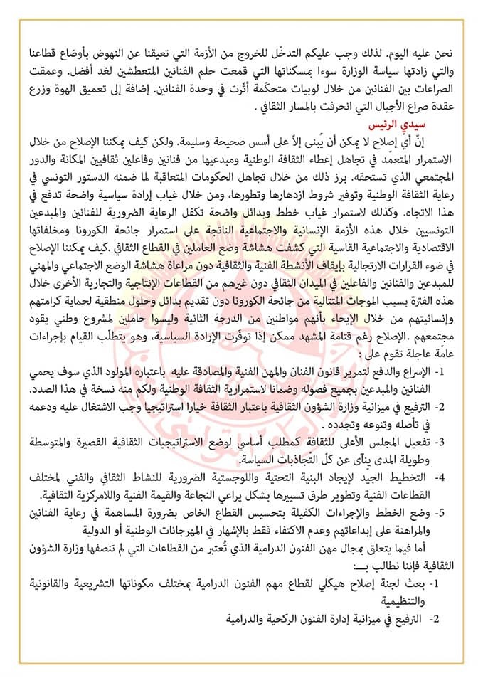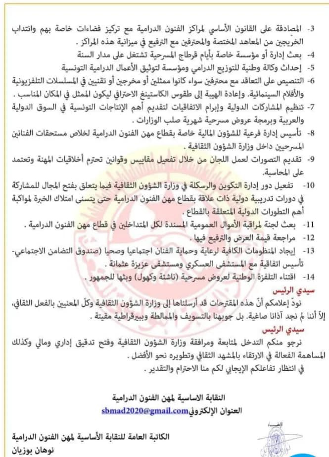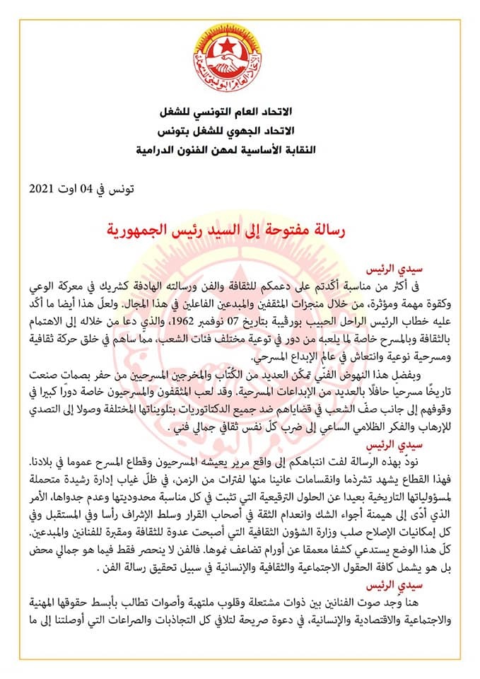 وجّهت النقابة الأساسية لمهن الفنون الدرامية رسالة مفتوحة إلى رئيس الدولة قدمت فيها توصيفا للوضع الثقافي وجملة من المقترحات والحلول والمشاريع التي من الممكن ان تنهض بأوضاع الفنانين الدراميين خاصة في ظل جائحة الكوفيد 19.