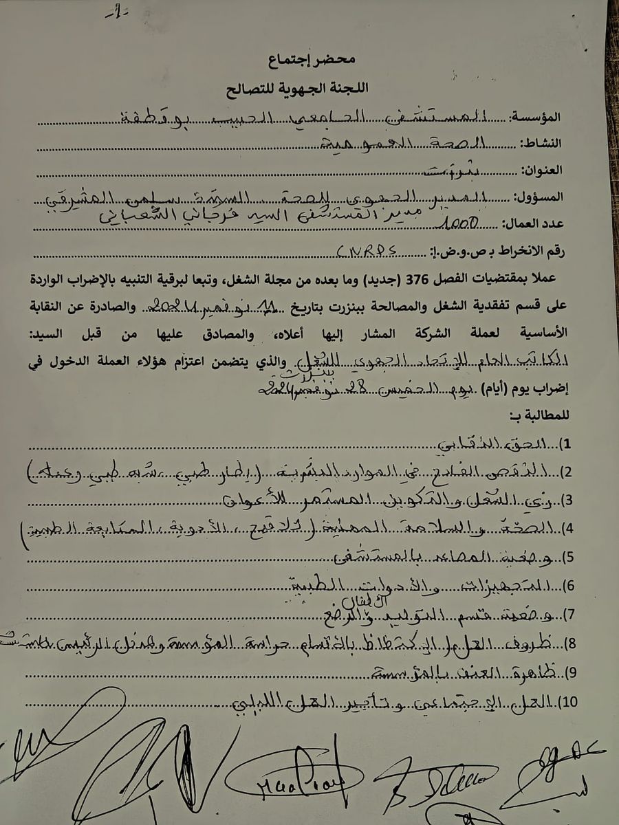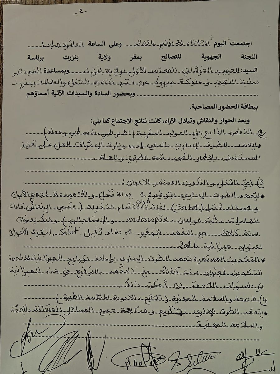 وقد انعقدت الجلسة التي أدارها المعتمد الأول للولاية الحبيب الخرشاني وبمساعدة كل من سنية النوي وملوكة مبروك بالطيب عن قسم تفقدية الشغل والمصالحة ببنزرت بحضور الطرف النقابي الأساسي والتنفيذي التابع للاتحاد الجهوي للشغل والطرف الإداري التابع للإدارة الجهوية للصحة ببنزرت وإدارة المستشفى .