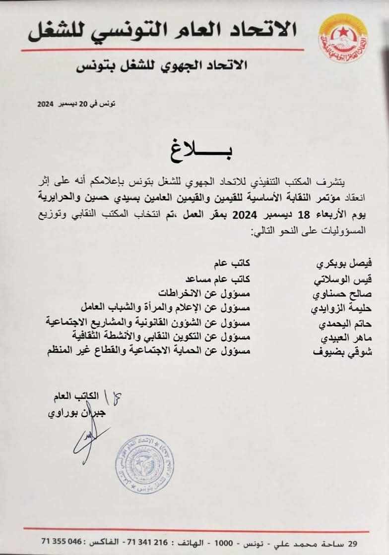 تنويه: تسرّب خطأ غير متعمّد في الخبر الذي نزّلناه يوم 18 ديسمبر الجاري حول توزيع المسؤوليات وقد تمّ تصحيحه