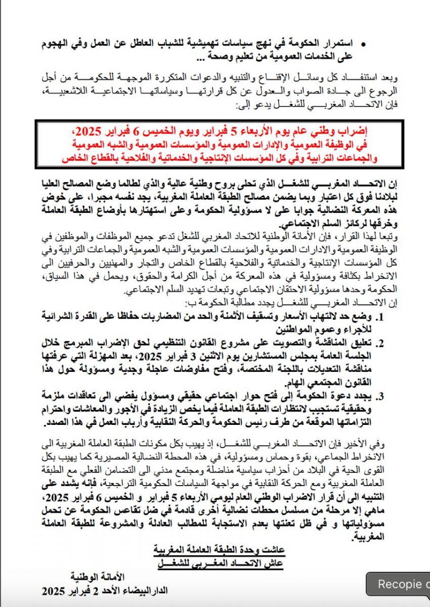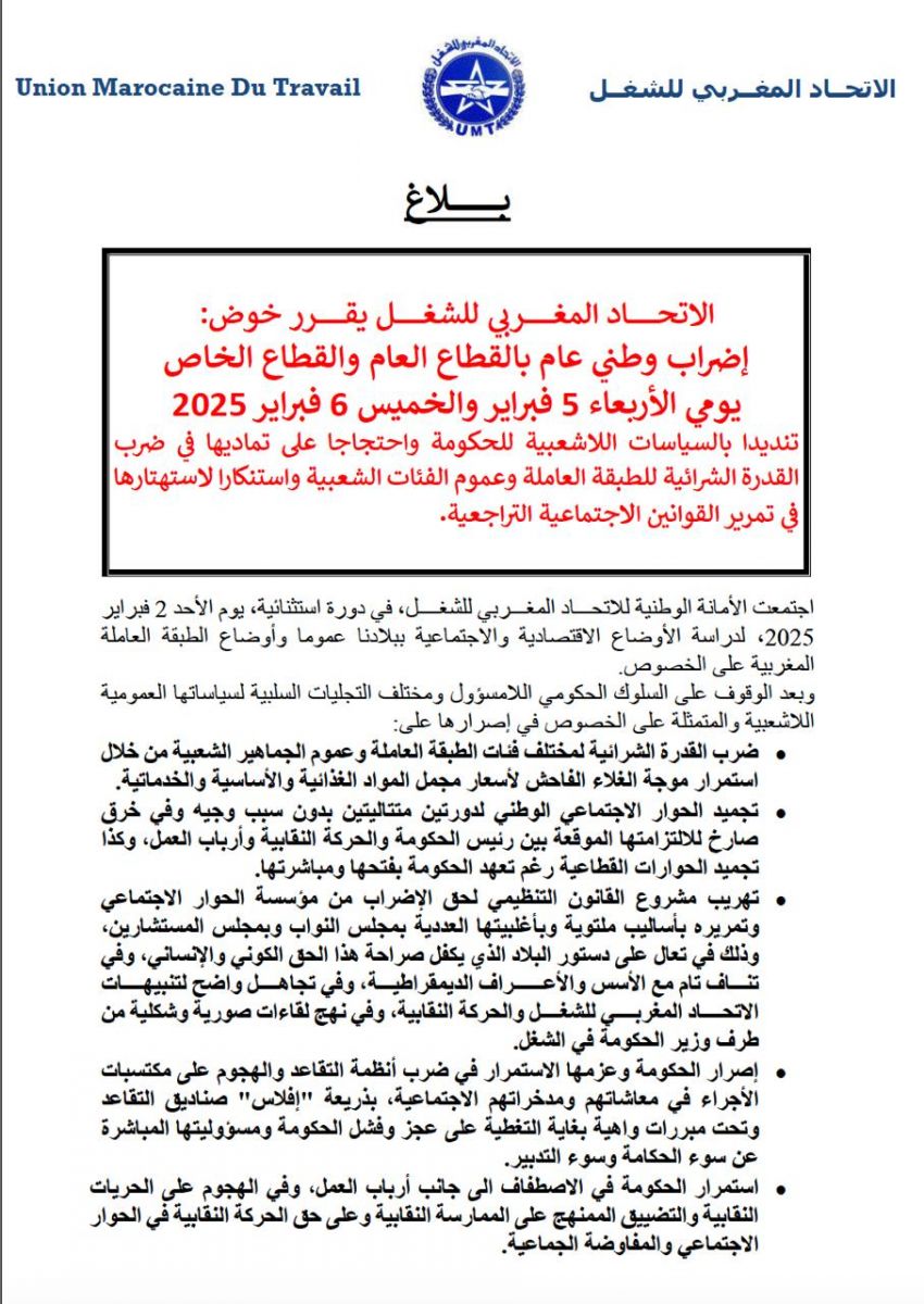 وقد قرر الاتحاد المغربي للشغل خوض إضراب عام يومي الأربعاء والخميس 5 و6 فيفري 2025 الجاري، مثلما ورد في بيان يوم امس الأحد 2 فيفري 2025 .