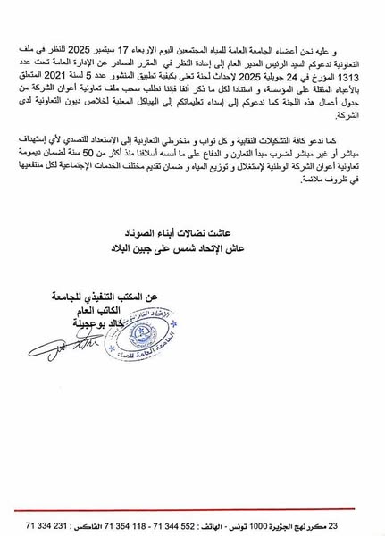 وفي هذا السياق، عبّرت الجامعة عن استنكارها لإحداث لجنة بموجب مقرر الإدارة العامة عدد 1313 المؤرخ في 24 جويلية 2025، للنظر في منع التكفل ببعض أعباء التعاونية استنادًا إلى المنشور عدد 5، معتبرة ذلك تهديدًا للسلم الاجتماعي داخل المؤسسة.