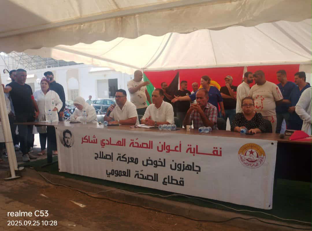 الشعب نيوز / صبري الزغيدي - بإشراف من الاتحاد الجهوي للشغل بصفاقس ، عقدت النقابة الأساسية لأعوان المستشفى الهادي شاكر يوم الخميس 25 سبتمبر 2025 اجتماعا عاما شارك فيه عدد محترم من الممرضات والممرضين، وذلك بحضور الفرع الجامعي للصحة ونقابات مستشفى الحبيب بورقيبة وقرقنة والمحرس والمصحات الخاصة بالجهة فضلا عن نقابات من التعليم الأساسي والبناء والنفط والبنوك.