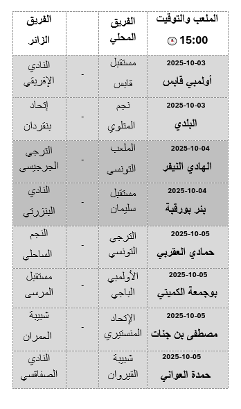 أعلنت الرابطة الوطنية لكرة القدم المحترفة، اليوم الجمعة 26 سبتمبر 2025 ، عن تعديل في مكان إقامة مباراة الجولة الثامنة ذهاب بين النادي البنزرتي والشبيبة  القيروانية، حيث تقرر نقل اللقاء إلى ملعب عبد العزيز الشتيوي بالمرسى بدلًا من الملعب البلدي بالكرم.