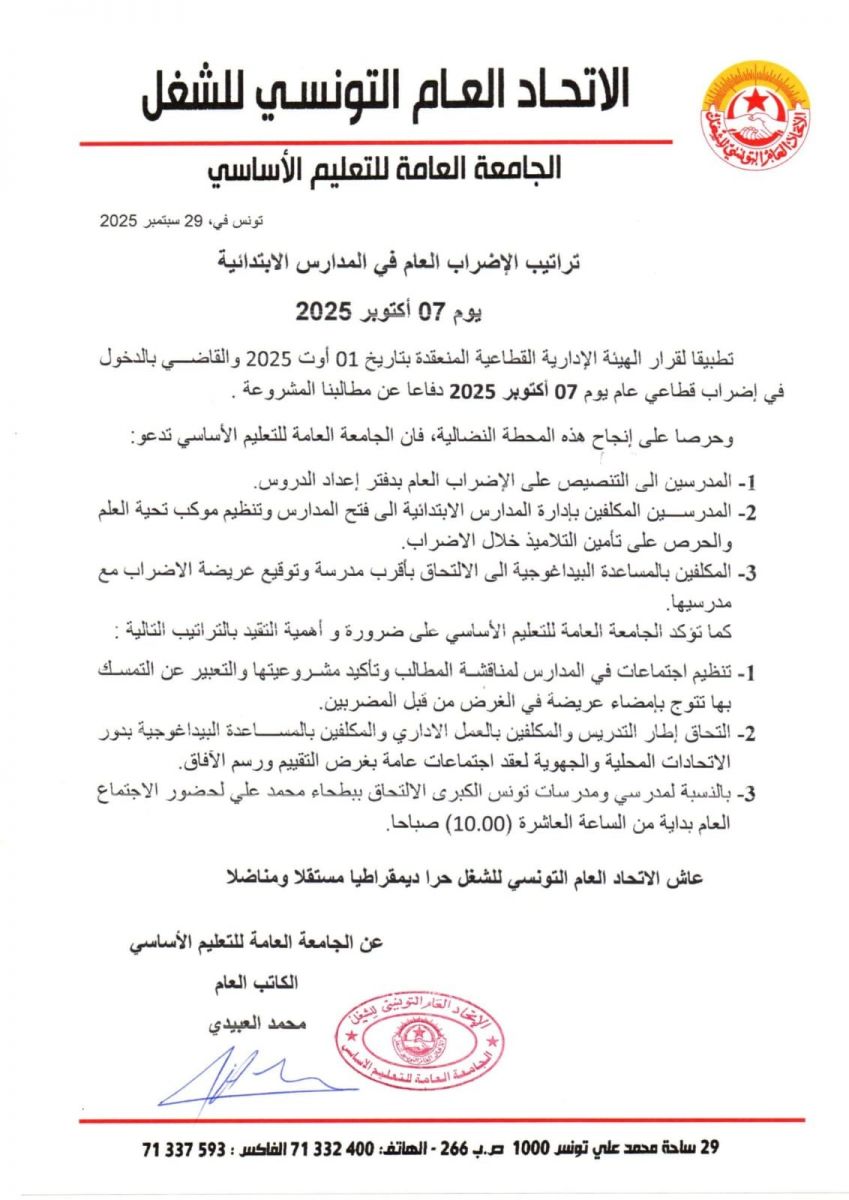 الشعب نيوز / تونس - أعلنت الجامعة العامة للتعليم الأساسي عن تنفيذ إضراب قطاعي عام في المدارس الابتدائية يوم الثلاثاء 7 أكتوبر 2025، وذلك استجابة لقرار الهيئة الإدارية القطاعية المنعقدة بتاريخ 1 أوت 2025 الماضي، والذي جاء دفاعًا عن جملة من المطالب التي وصفتها الجامعة بـ"المشروعة".