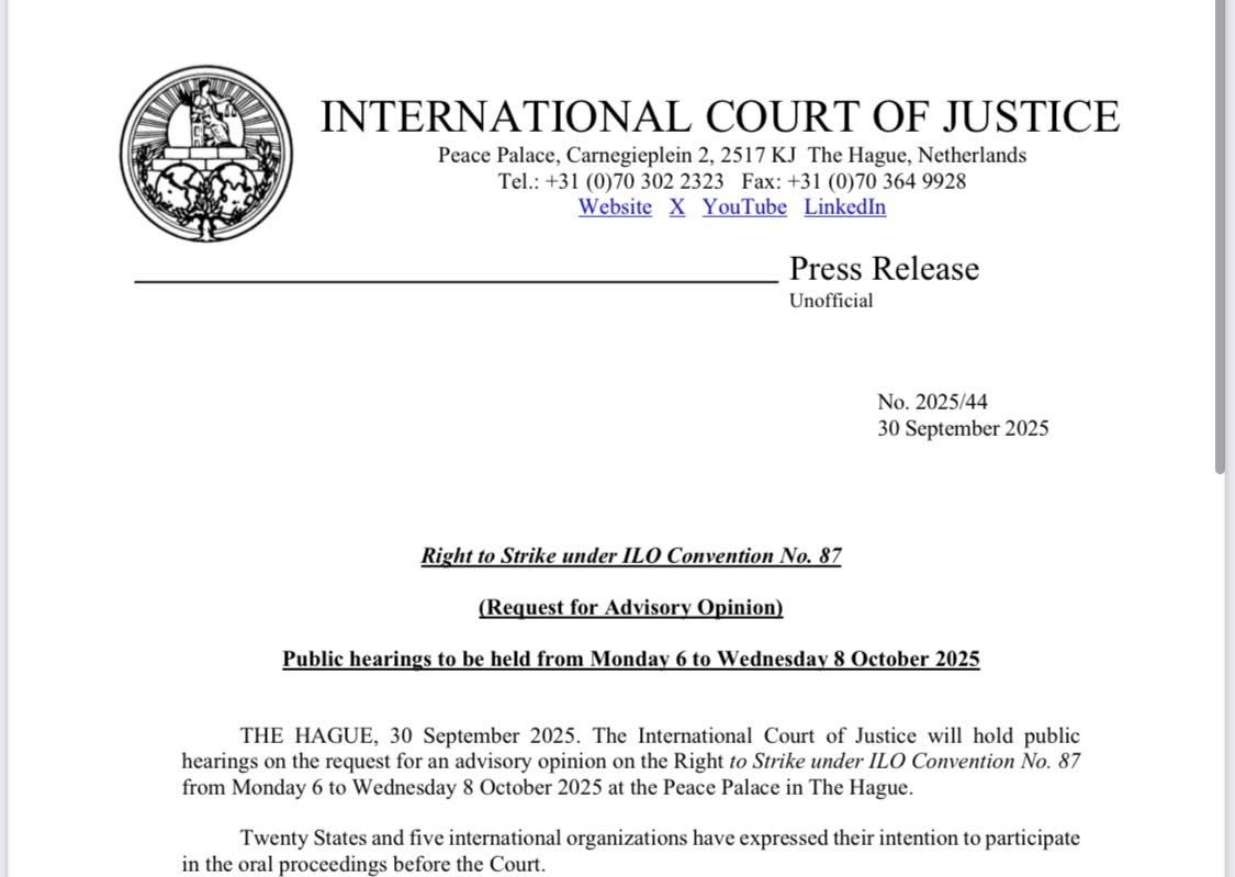 الشعب نيوز/ باقلام النقابيين - أعلنت محكمة العدل الدولية أنها ستعقد جلسات استماع علنية من 6 إلى 8 أكتوبر 2025 في قصر السلام بمدينة لاهاي، للنظر في الطلب المتعلق بإصدار رأي استشاري حول الحق في الإضراب في ضوء اتفاقية منظمة العمل الدولية رقم 87 لسنة 1948 بشأن الحرية النقابية وحماية حق التنظيم.