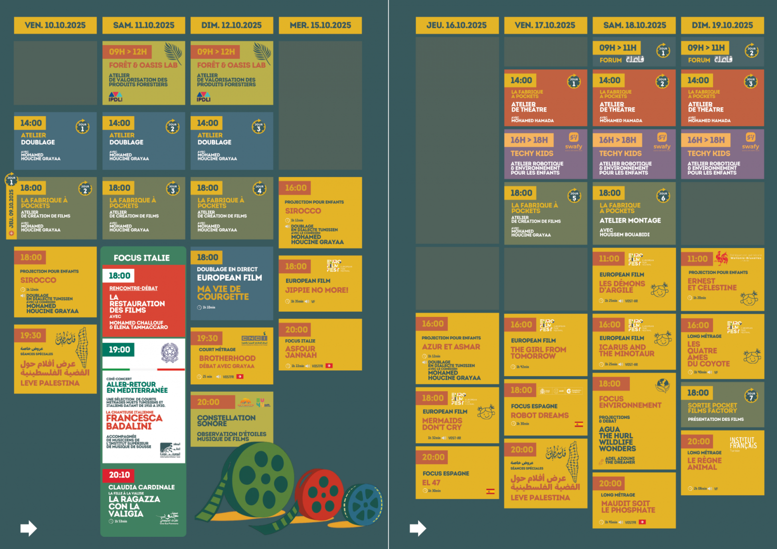 • ورشات سينما للصغار والكبار: ورشة دبلجة للأطفال، ورشة في الروبوتيك والبيئة، وتكوين في صناعة الأفلام .