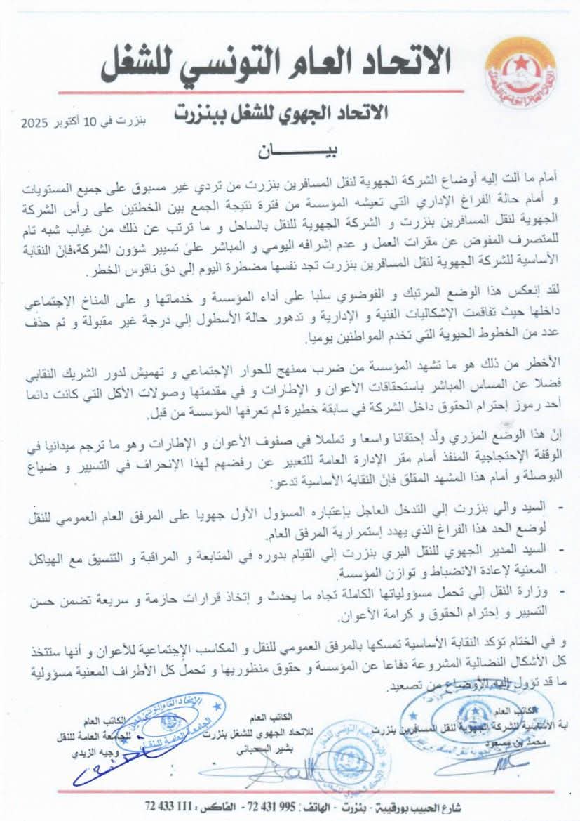 في ما يلي صورة لنص بيان النقابة الاساسية للشركة الجهوية لنقل المسافرين ببنزرت :