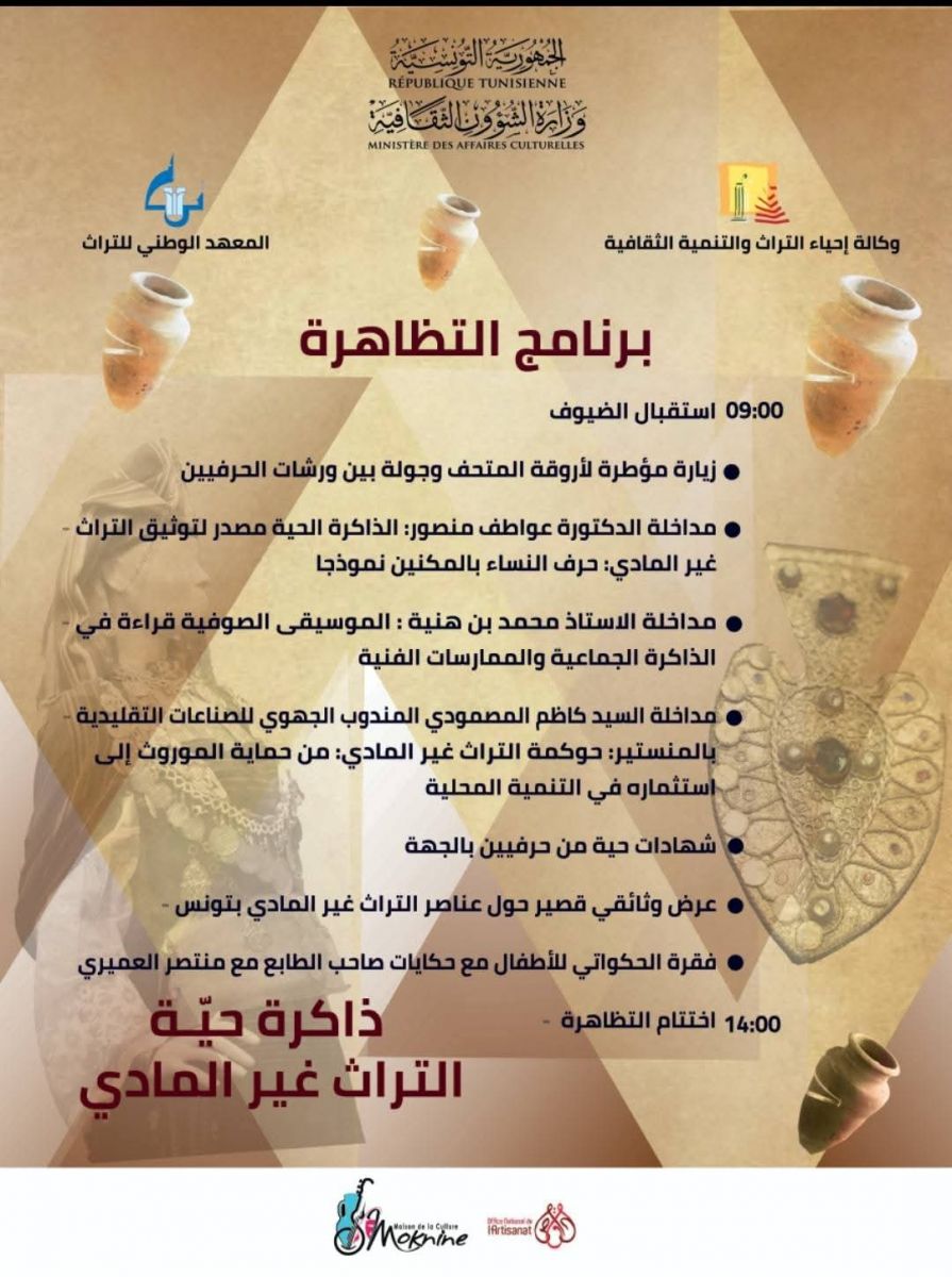 وتهدف هذه التظاهرة إلى إبراز التراث غير المادي كرافد حضاري أصيل يُجسّد استمرارية الذاكرة الحيّة للمجتمعات، ويؤكد على قيمته كأداة للتنمية الثقافية والاجتماعية والاقتصادية، فضلاً عن مساهمته في صون خصوصية المكنين وتعزيز حضورها ضمن المشهد الثقافي الوطني والدولي.