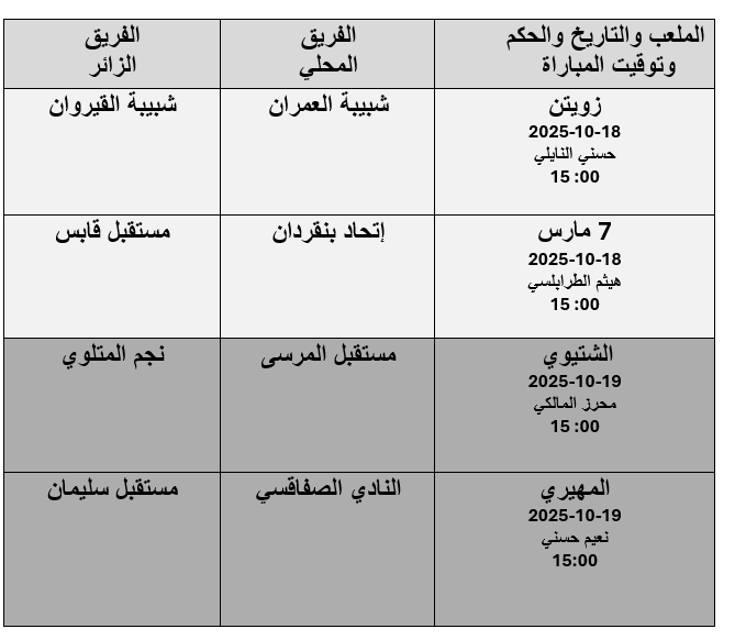 كشفت الادارة الوطنية للتحكيم اليوم الخميس 16 أكتوبر 2025 عن تعيينات حكام مقابلات الدفعتين الاولى و الثانية من الجولة العاشرة من البطولة والتي ستقام يومي السبت والأحد 18 و19 أكتوبر 2025 و في مايلي التعيينات :