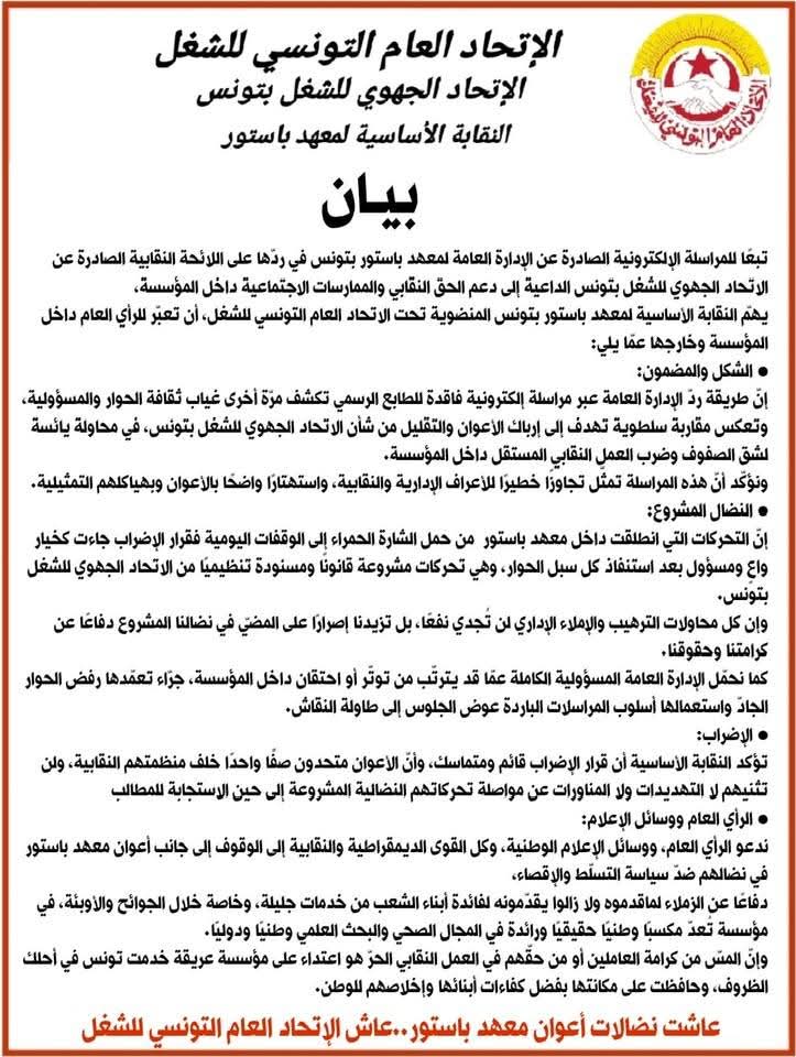 في مايلي صورة لنص بيان النقابة الأساسية لمعهد باستور بتونس :