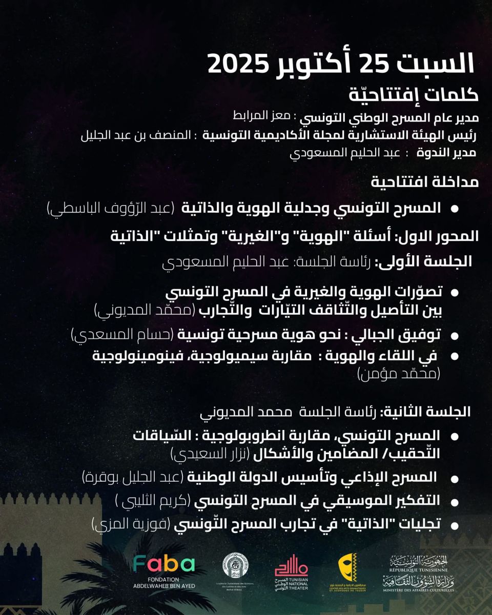 الشعب نيوز / ناجح مبارك - في إطار فعاليات الدورة الثالثة من المهرجان الوطني للمسرح – مواسم الإبداع، تنظَّم ندوة علمية كبرى بتوزر يومي السبت و الأحد 25 و26 أكتوبر 2025، بالشراكة بين المسرح الوطني التونسي والمجمع التونسي للعلوم والآداب والفنون "بيت الحكمة"، تحت عنوان: "المسرح التونسي: أسئلة "الهوية" و " الغيرية" وتمثّلات "الذاتية"– نحو "مدرسة تونسية" في المسرح ؟".