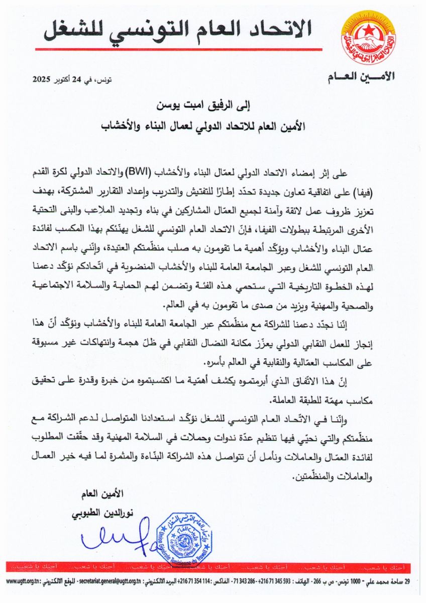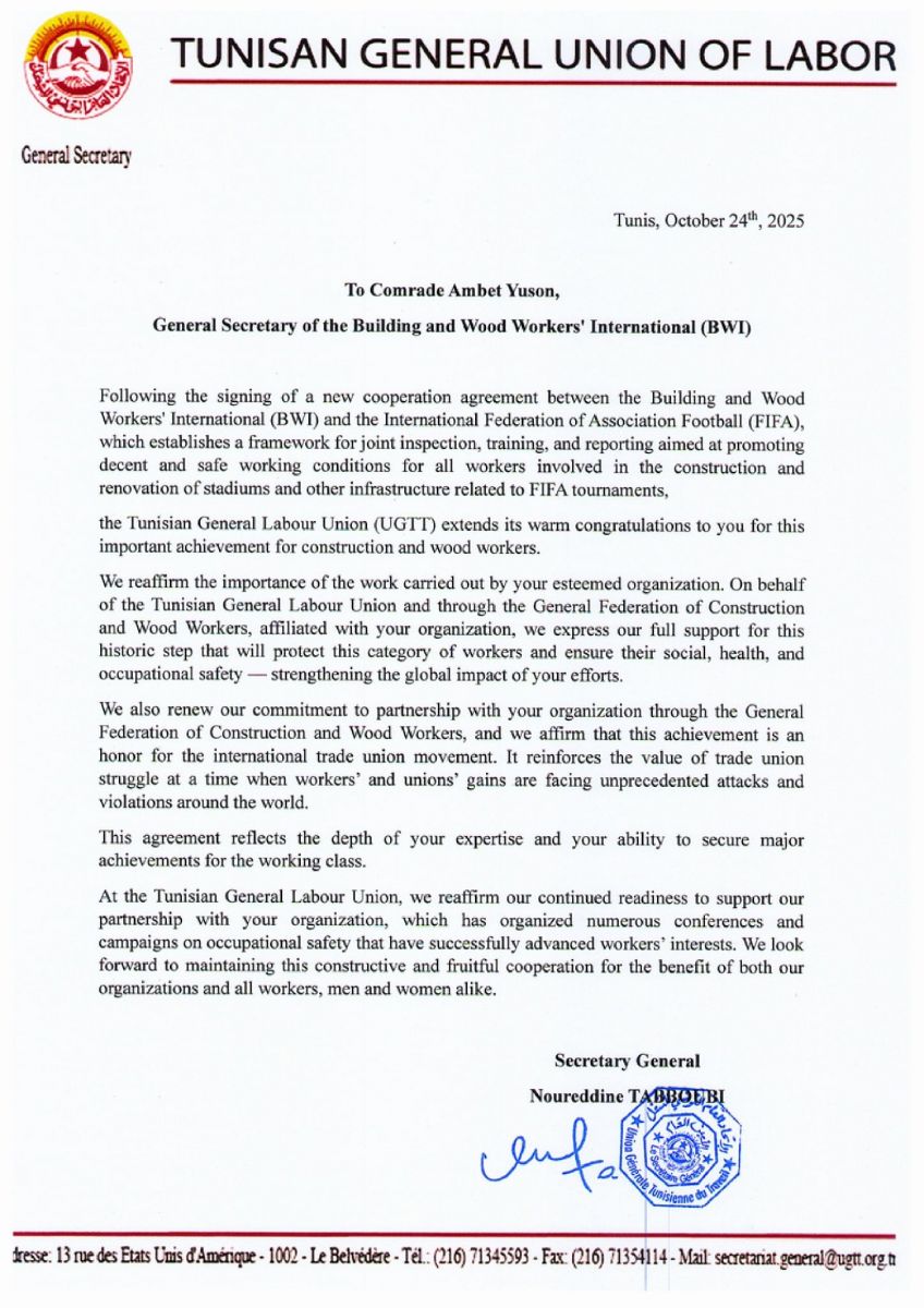 " على إثر إمضاء الاتحاد الدولي لعمال البناء والأخشاب (BWI) والاتحاد الدولي لكرة القدم (فيفا) على اتفاقية تعاون جديدة تحدد إطارا للتفتيش والتدريب وإعداد التقارير المشتركة، بهدف تعزيز ظروف عمل لائقة وآمنة لجميع العمال المشاركين في بناء وتجديد الملاعب والبنى التحتية الأخرى المرتبطة ببطولات الفيفا، فإنّ الاتحاد العام التونسي للشغل يهنئكم بهذا المكسب الفائدة عمال البناء والأخشاب ويؤكد أهمية ما تقومون به صلب منظمتكم العتيدة، وإنني باسم الاتحاد العام التونسي للشغل وعبر الجامعة العامة للبناء والأخشاب المنضوية في اتحادكم نؤكد دعمنا لهذه الخطوة التاريخية التي ستحمي هذه الفئة وتضمن لهم الحماية والسلامة الاجتماعية والصحية والمهنية ويزيد من صدى ما تقومون به في العالم.