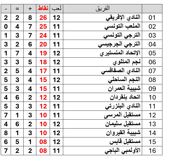 و على ضوء نتائج المقابلات المذكورة ، يصبح ترتيب البطولة مؤقتا على النحو التالي :