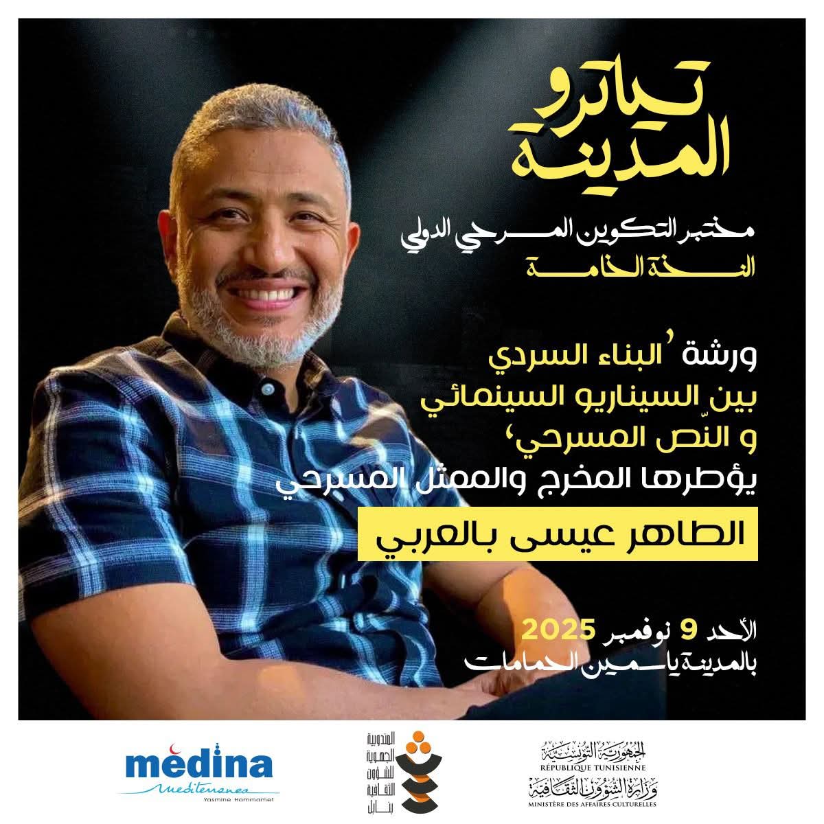 موضوع الورشة : البناء السردي بين السيناريو السينمائي و النّص المسرحي.اما الشخصيات الفنية المكرمة فتضم "سيدة الدراما والمسرح التونسي" مني نورالدين.