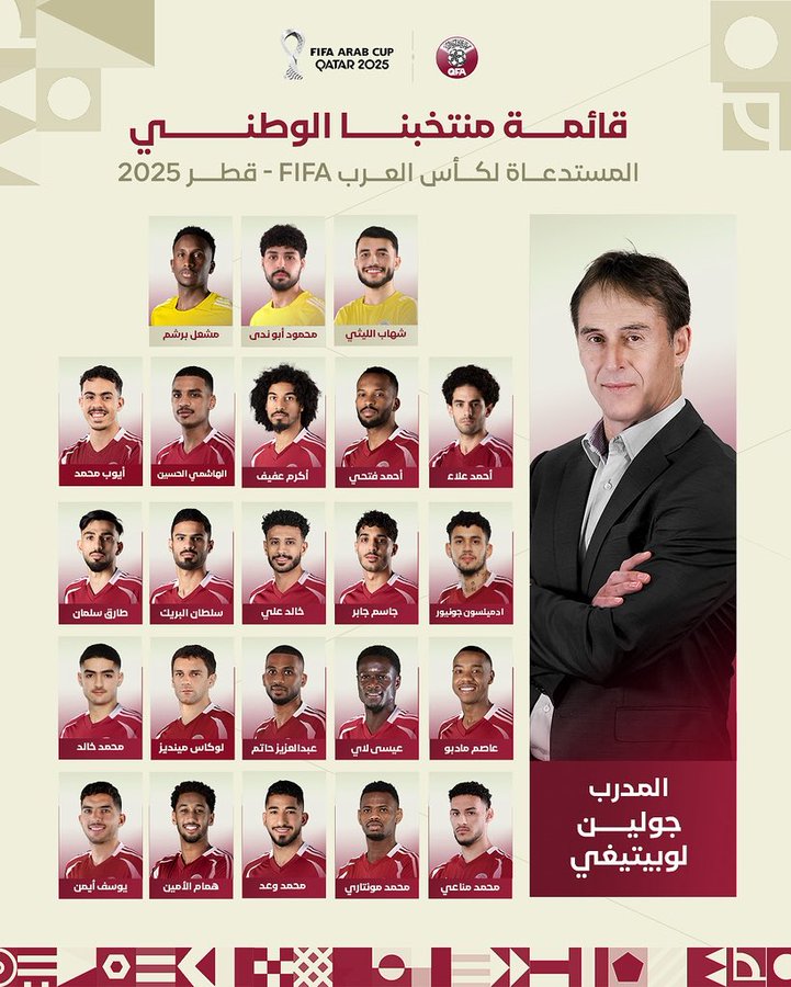 أعلن الإسباني جولين لوبيتيغي، مدرب المنتخب القطري، القائمة النهائية للعنابي استعداداً لخوض منافسات بطولة كأس العرب قطر 2025، التي ستقام بين الأول والثامن عشر من ديسمبر 2025 المقبل.