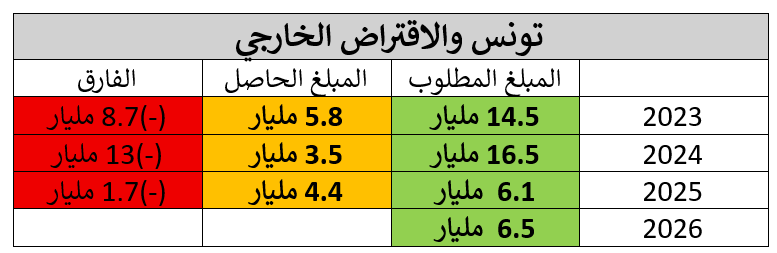 وفي سنة 2025 راهنت الدولة على تجميع 6.1 مليار دينار ولم تحصل الا على 4.4 وتسعى الحكومة من خلال قانون المالية لسنة 2026 الى جمع 6.5 مليار دينار من الاقتراض الخارجي واعتبر ان كل هذه الأرقام تؤكد ان الاقتراض الداخلي اضطرار وليس خيار.