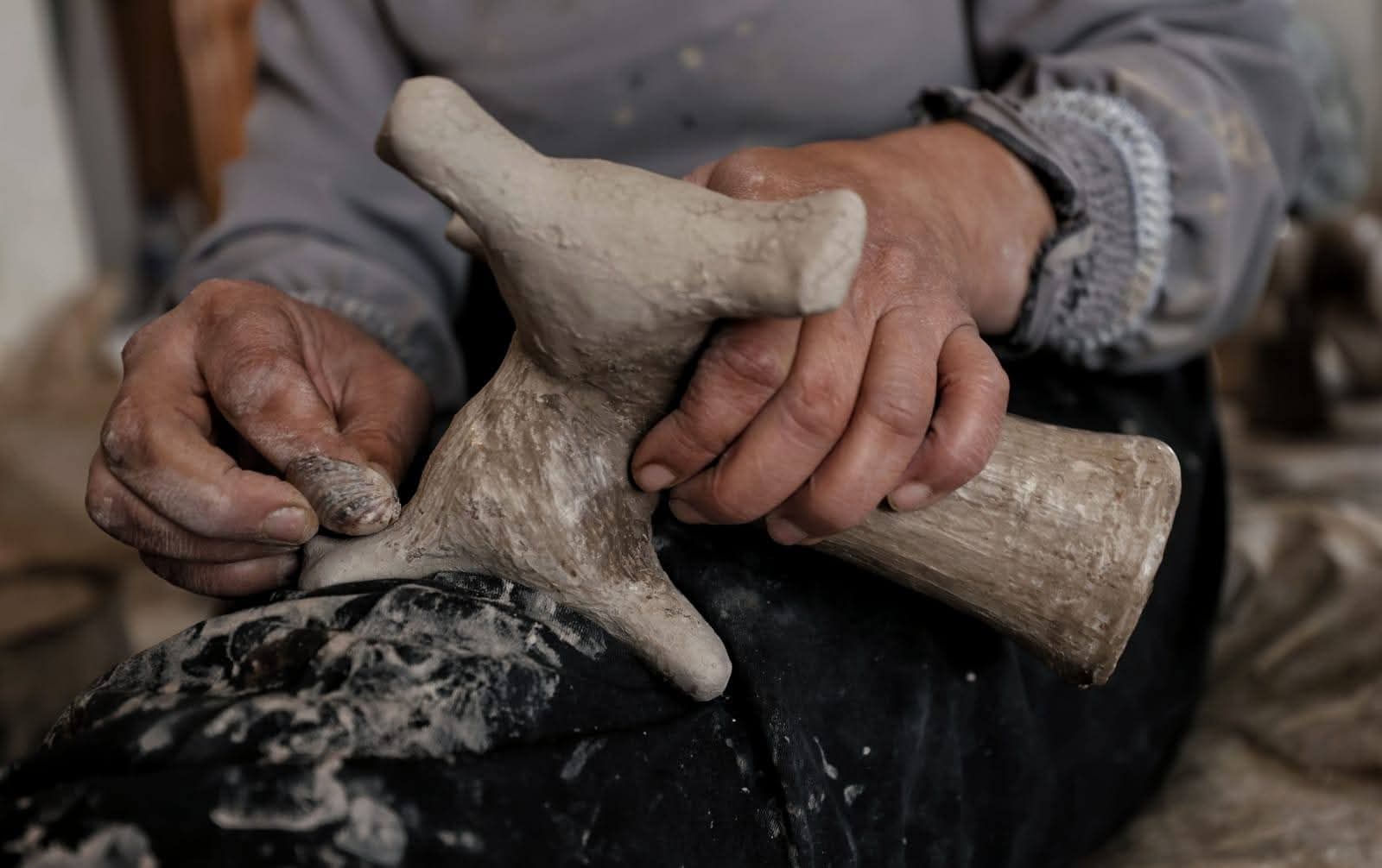 "العمل في الفخار يحتاج صبرًا طويلًا وتركيزًا. فبعد أن ننتهي من العجن والتشكيل، نترك القطع لتمر بمرحلة الطفون حتى تشتد وتصبح جاهزة للتجفيف.
