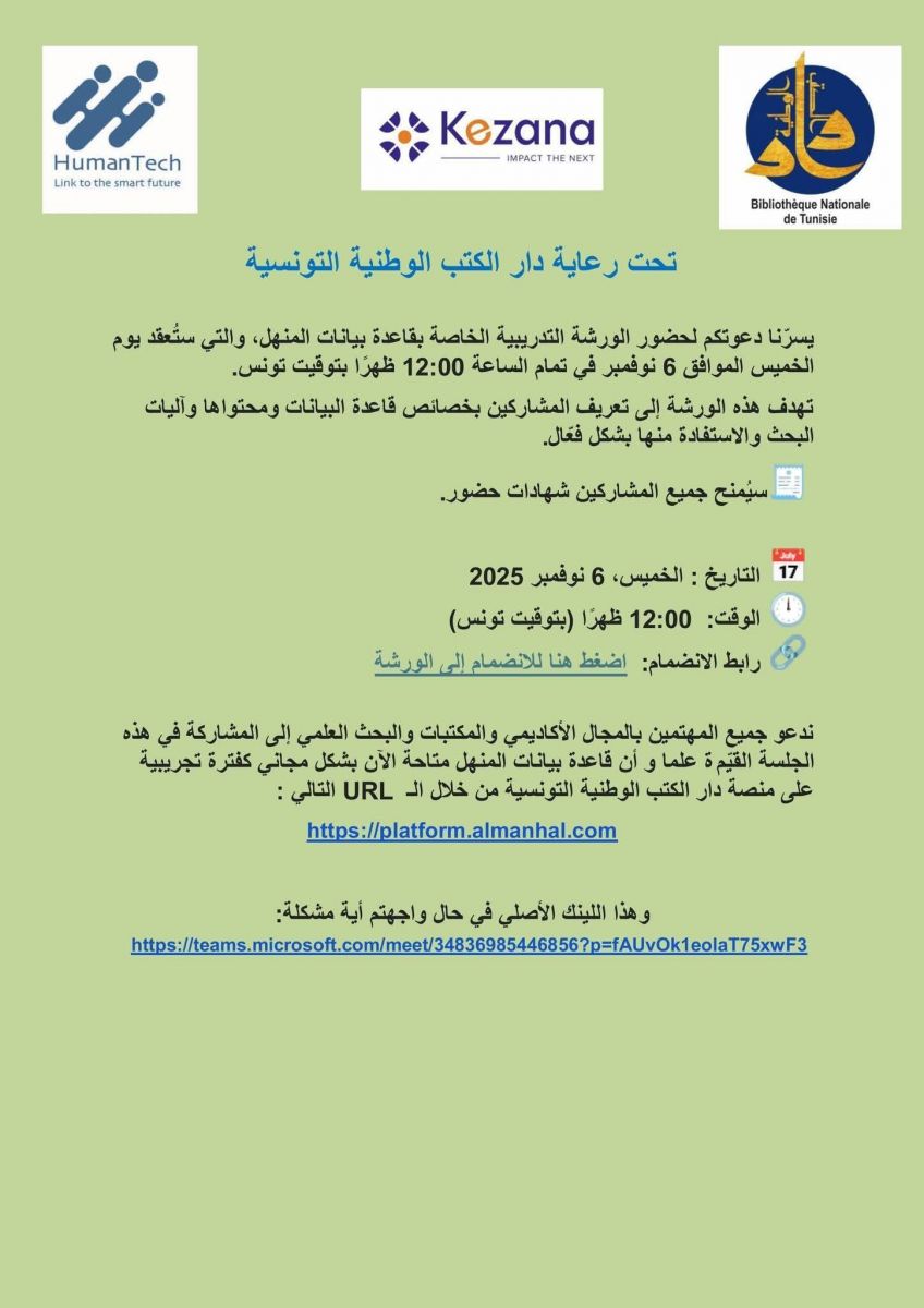 الشعب نيوز / ناجح مبارك - تنظّم دار الكتب الوطنية التونسية يوم السبت 6 ديسمبر 2025 ورشة تدريبية مخصّصة للتعريف بقاعدة بيانات المنهل، وذلك بالشراكة مع مؤسستَي HumanTech وKezana، في إطار دعمها المتواصل للباحثين وتعزيز قدرات المهنيين في قطاع المكتبات والتوثيق.