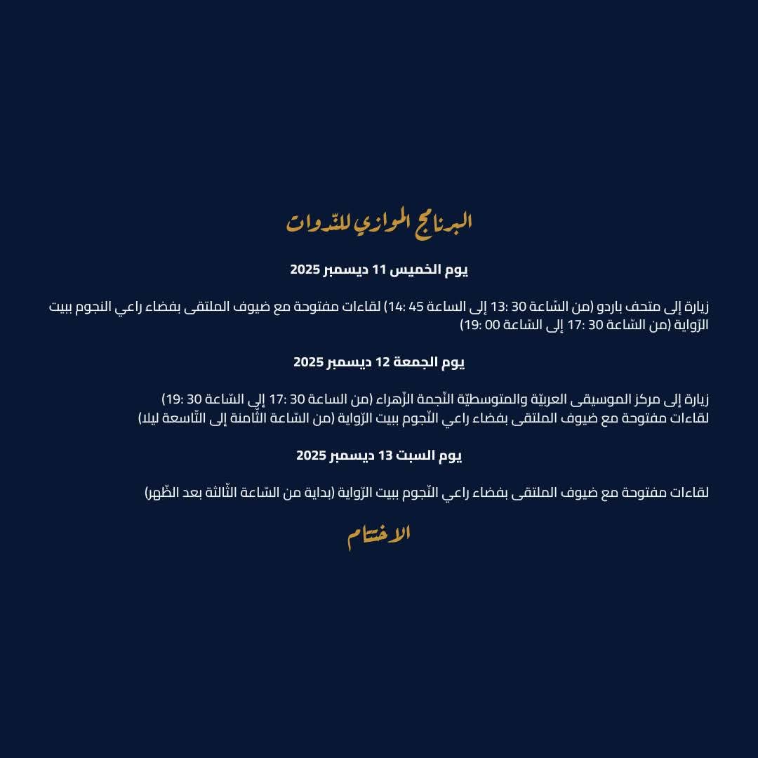 والجدير بالذكر أن حفل الافتتاح سيكون يوم الأربعاء 10 ديسمبر 2025 على الساعة الخامسة مساء بمسرح المبدعين الشبان بمدينة الثقافة الشاذلي القليبي بتقديم عرض فني موسيقي بعنوان "حلم" برعاية مسرح الأوبرا لتتواصل أشغال الملتقى إلى غاية يوم السبت 13 ديسمبر 2025 بدار الكتب الوطنية.